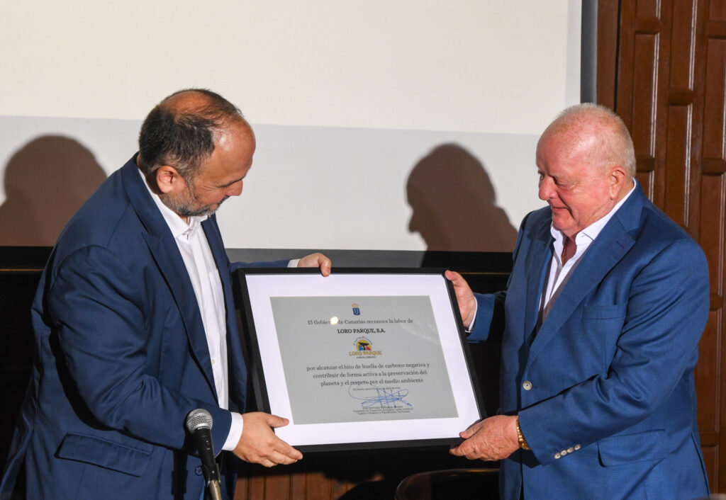 Der Loro Parque ist der einzige Zoo der Welt, der einen negativen CO2-Fußabdruck hat. Dies ist ein Ereignis, das nicht nur für das Unternehmen, sondern auch für den Kampf gegen den Klimawandel einen Wendepunkt darstellt. Bei einem Besuch heute, am 3. April, überreichte der Minister für Ökologischen Wandel, Kampf gegen den Klimawandel und Raumplanung der Regierung der Kanarischen Inseln, José Antonio Valbuena, dem Loro Parque eine Auszeichnung für diese außergewöhnliche Leistung.