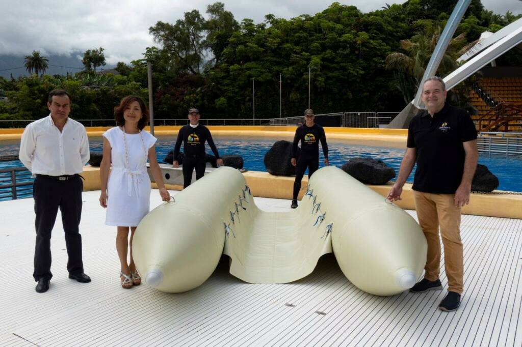 En la mañana de ayer, martes 30 de junio, la empresa Woosung Inflatable Boat Europe (ZEBEC), fabricante de los flotadores del parque acuático Siam Park, ha hecho entrega a Loro Parque Fundación de un primer prototipo de pontón para la reflotación de cetáceos.