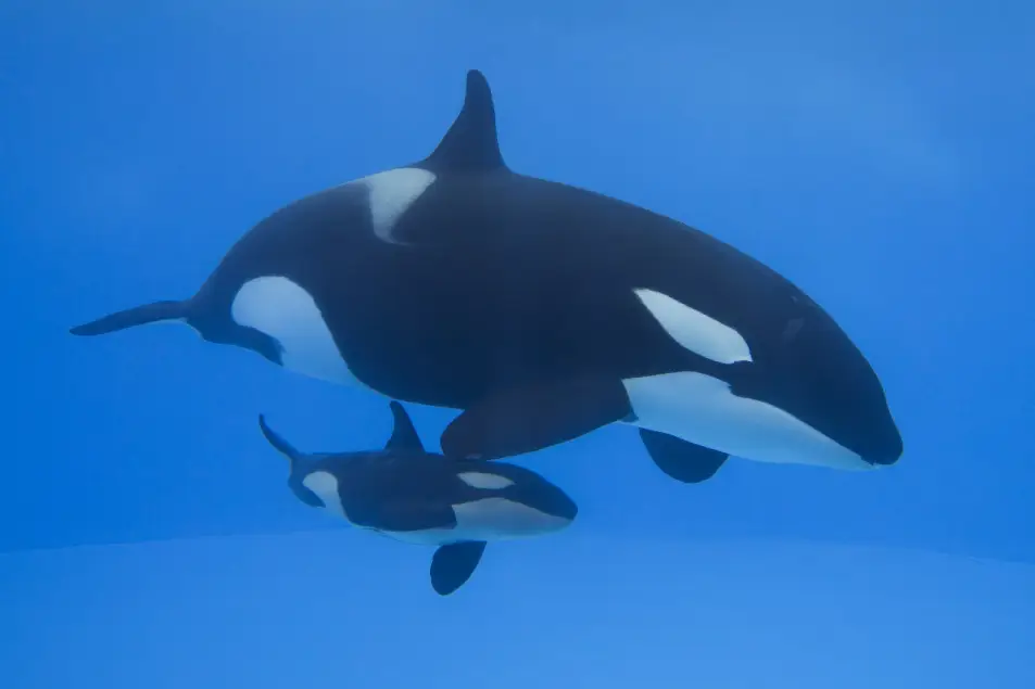 Orcas sind sehr fürsorgliche Tiere. Mütter beschützen ihre Kälber und werden dabei von jungen Weibchen der Gruppe unterstützt. Geburten erfolgen alle 3 bis 10 Jahre nach einer Tragzeit von etwa 17 Monaten. Meist wird ein Kalb geboren, das bis zu zwei Jahre gesäugt wird.